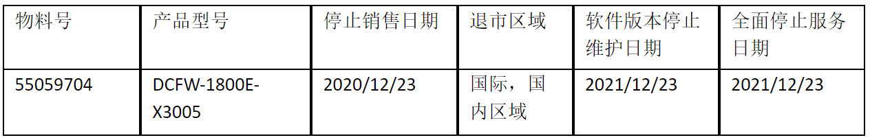 北京神州数码leyu.乐鱼信息技术有限公司正式通知您, 以上DCFW-1800E-X3005下一代防火墙(55059704)将于2020年12月23号停止接收新的订单(具体日期见上表),不再供货。给您带来的不便,敬请原谅。